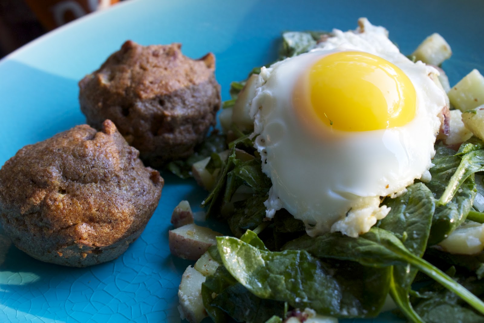 The Sunny Side Up Salad is a warm spinach and potato salad with a red wine & mustard vinaigrette, topped with a fried egg. Sunny side up of course.
